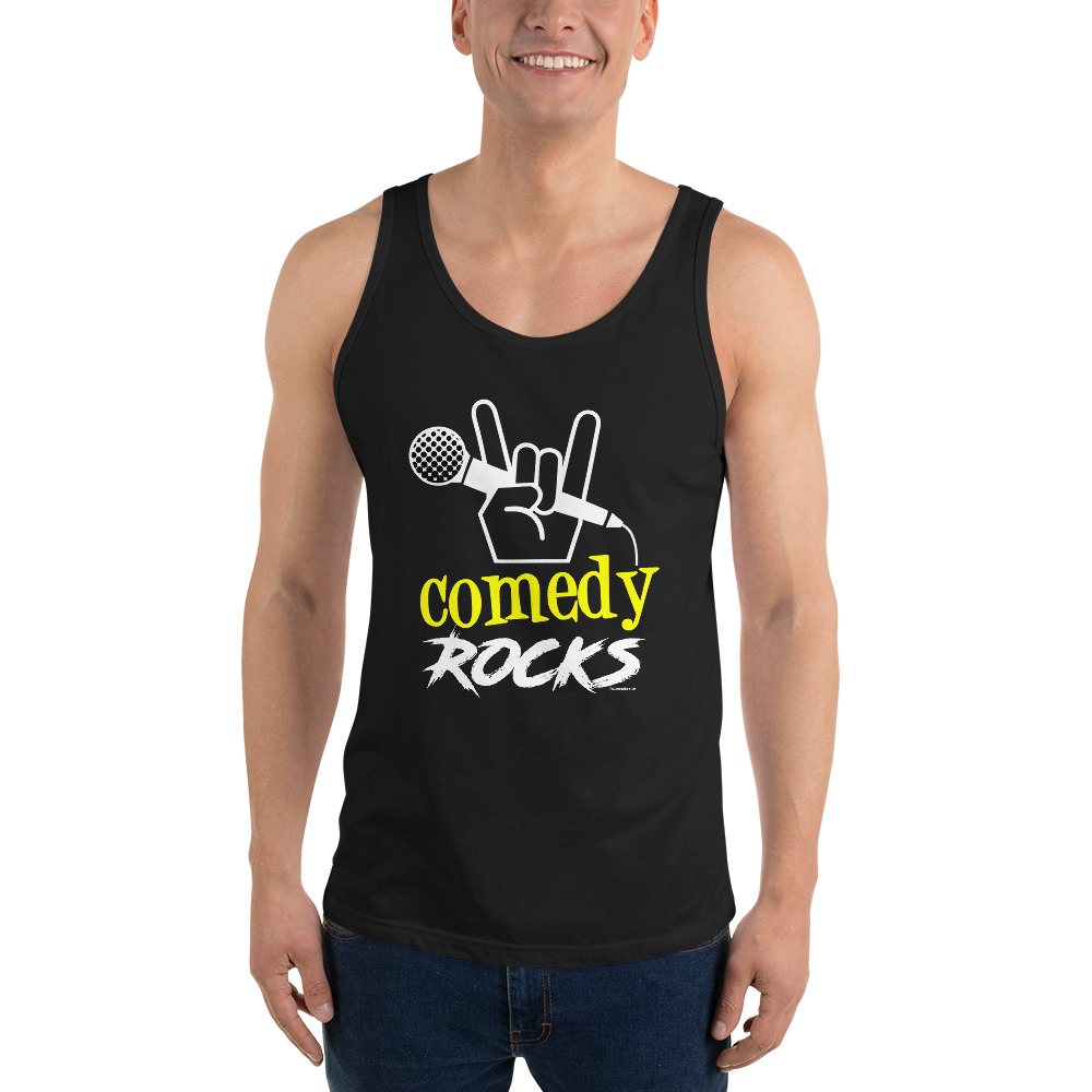 Show off those toned arms with some comic rockability! This design is bold on this classic, all-purpose unisex tank. Whether it’s your impressive guns or the fact you are recognized as a comic, this timeless look is for anyone looking to book a gig.